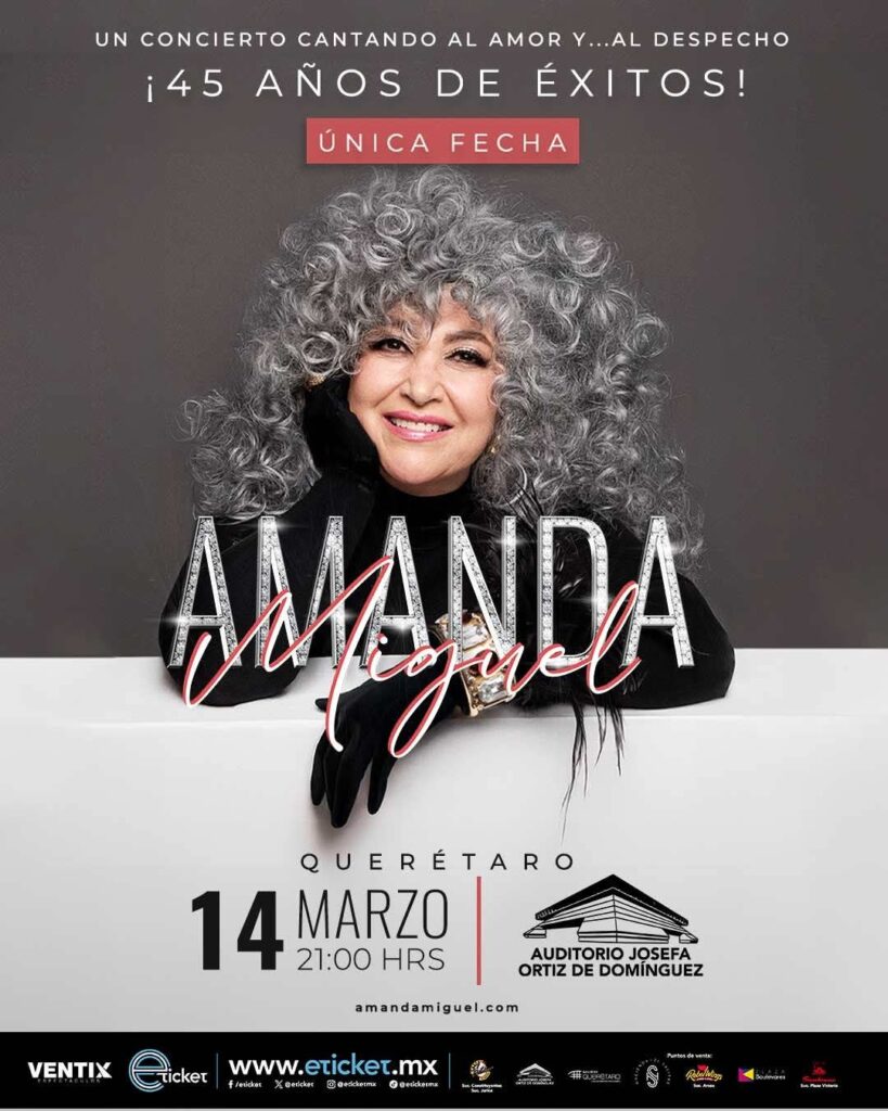 Querétaro a 12 de marzo del 2026 º La cantante Amanda Miguel se presentará en el Auditorio Josefa Ortiz en el estado de Querétaro este próximo sábado 14 de marzo.