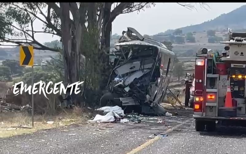 Querétaro a 22 de abril del 2026 º Un camión de pasajeros se impactó contra un árbol cuando circulaba en la carretera San Juan del Río–Amealco, en Querétaro, lo que dejó como saldo 9 personas sin vida y más de 20 lesionados.