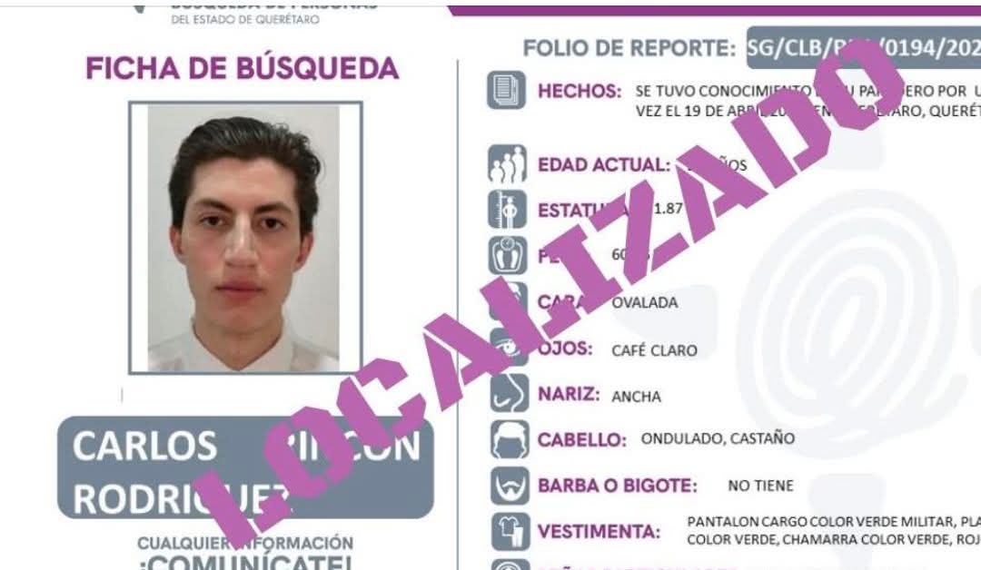 Querétaro a martes 27 de abril del 2026 º 🕊️ De manera extraoficial, se dio a conocer que el joven de 25 años Carlos Rincón Rodríguez fue localizado; sin embargo, trascendió que lamentablemente fue hallado sin vida.