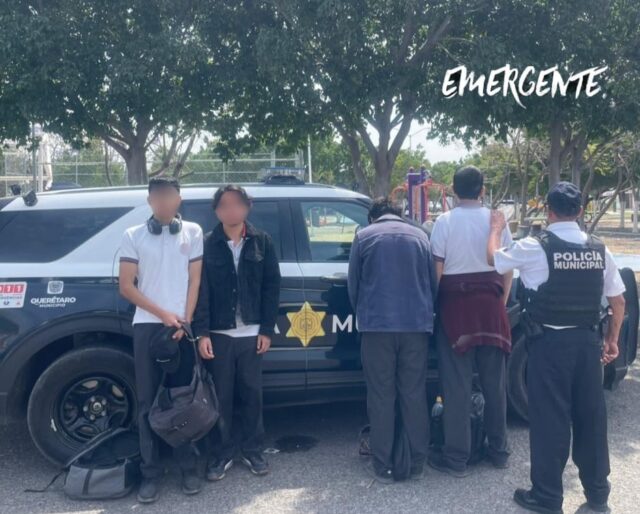 Querétaro a 09 de marzo del 2026 º Derivado a recorridos de prevención y vigilancia en la colonia Puertas de Belén, elementos policiales de la #SSPMQ detuvieron a cuatro masculinos por ingerir bebidas embriagantes en el parque de esa colonia.