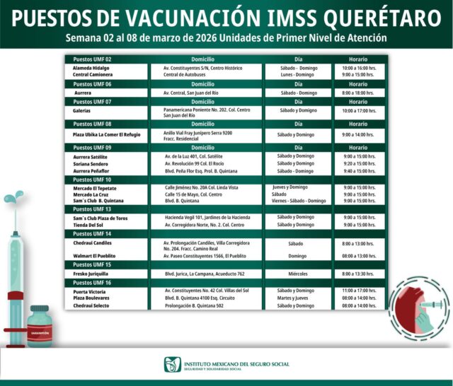 Querétaro a 03 de marzo del 2026 º El Instituto Mexicano del Seguro Social (IMSS) en Querétaro ha anunciado el despliegue de brigadas de vacunación en diversos centros comerciales, mercados y puntos estratégicos de la entidad. Esta jornada, que se llevará a cabo durante la semana del 2 al 8 de marzo de 2026, busca facilitar el acceso a la salud a través de las Unidades de Primer Nivel de Atención, instalando puestos de control fuera de las clínicas tradicionales para mayor comodidad de la ciudadanía.