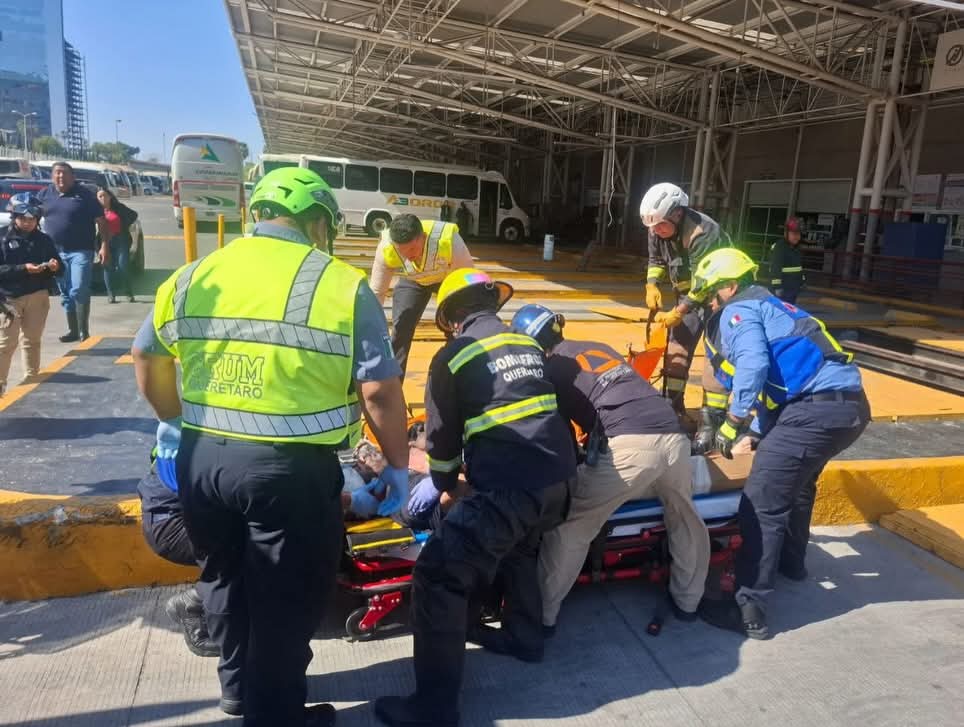 Querétaro a 19 de diciembre del 2025 º Esta mañana de viernes, paramédicos y rescatistas de Bomberos y de Protección Civil, fueron canalizados a la Terminal de Autobuses Querétaro (TAQ), en donde se reportó una persona lesionada tras caer al interior de una fosa de residuos.