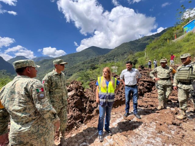 Durante el recorrido, la presidenta estuvo acompañada por elementos del Ejército Mexicano y del departamento de obras públicas municipales quienes brindan apoyo logístico y operativo en las tareas de recuperación.